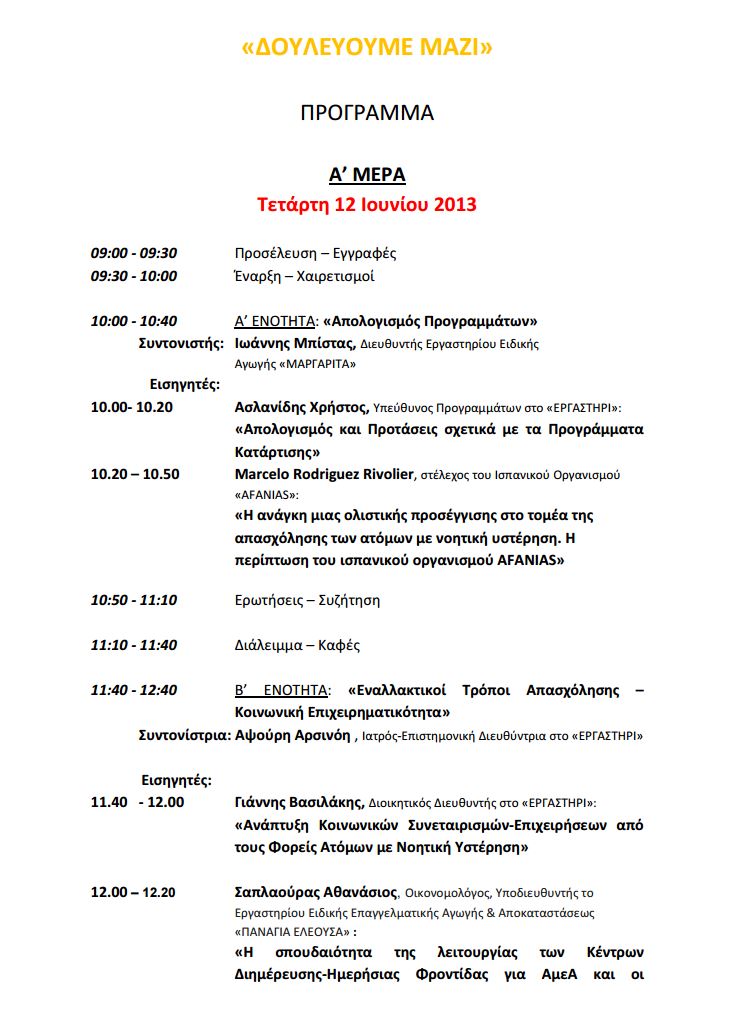 «ΔΟΥΛΕΥΟΥΜΕ ΜΑΖΙ» Τετάρτη 12 & την Πέμπτη 13 Ιουνίου 2013. Η ΜΕΛΕΔΩΝΗ – ΠΑΝΕΛΛΗΝΙΑ ΕΝΩΣΗ ΦΟΡΕΩΝ ΣΤΗΡΙΞΗΣ ΑΤΟΜΩΝ ΜΕ ΝΟΗΤΙΚΗ ΥΣΤΕΡΗΣΗ (Αστική μη Κερδοσκοπική Εταιρία), της οποίας μέλη είναι «ΤΟ ΕΡΓΑΣΤΗΡΙ», η «ΕΣΤΙΑ», η «ΜΑΡΓΑΡΙΤΑ» και η «ΠΑΝΑΓΙΑ ΕΛΕΟΥΣΑ» διοργανώνει διημερίδα με τίτλο «Δουλεύουμε Μαζί» στον πολυχώρο «ΤΕΧΝΟΠΟΛΙΣ» του Δήμου Αθηναίων (κτίριο 10) την Τετάρτη 12 & την Πέμπτη 13 Ιουνίου 2013. Την 1η μέρα από τις 9:00 έως τις 14:00 θα συζητηθούν ο Απολογισμός των Ολοκληρωμένων Προγραμμάτων Προκατάρτισης και Κατάρτισης του Υπουργείου Εργασίας Κοινωνικής Ασφάλισης και Πρόνοιας που υλοποίησαν οι φορείς τους προηγούμενους μήνες, οι εναλλακτικοί τρόποι απασχόλησης για τα άτομα με νοητική υστέρηση, η κοινωνική επιχειρηματικότητα καθώς και οι σύγχρονες τάσεις – οι καλές πρακτικές και τα μελλοντικά βήματα του χώρου μας. Τις θεματικές θα αναπτύξουν εισηγητές από το Εργαστήρι, από άλλους φορείς και από την Ευρωπαϊκή Ένωση. Τη δεύτερη μέρα το απόγευμα 18:00-20:00 το τμήμα της ζαχαροπλαστικής του Εργαστηρίου θα παρουσιάσει μέρος της δουλειάς του ως αποτέλεσμα της τετράμηνης κατάρτισής του. Το τμήμα θα πλαισιώσει και θα βοηθήσει με την παρουσία της η διάσημη σεφ κ. Μυρσίνη Λαμπράκη. Την ευχαριστούμε θερμά. «Το όνειρο παραμένει ζωντανό» «ΔΟΥΛΕΥΟΥΜΕ ΜΑΖΙ» Print 11354 Tags: ΕΣΤΙΑ ΜΑΡΓΑΡΙΤΑ ΜΕΛΕΔΩΝΗ ΠΑΝΑΓΙΑ ΕΛΕΟΥΣΑ